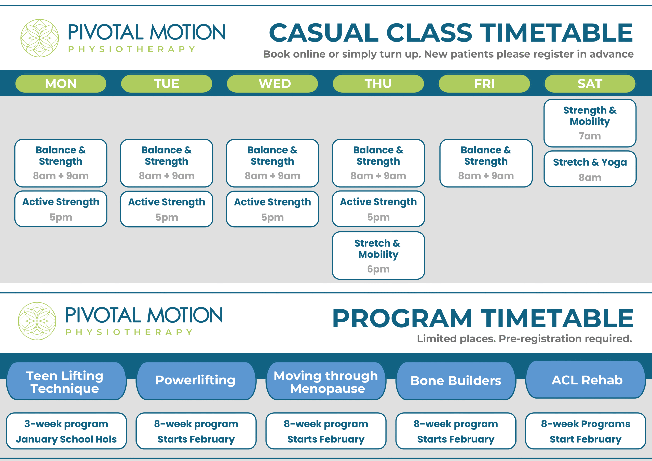 At Pivotal Motion Physiotherapy, we are excited to offer our Strength and Technique class, a powerlifting-focused session that pushes your physical and mental limits. Each one-hour session of the 8-week block is designed to help you explore and unlock your full potential through the mastery of three fundamental powerlifting movements: squats, bench press, and deadlifts.