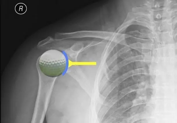 Think of the shoulder joint like a golf ball sitting on a tee. The golf ball is much larger than the tee. To help with the stability of the joint there is the labrum (blue). It makes the surface of the tee a little larger.