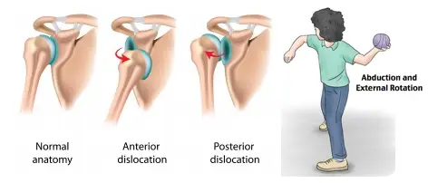 In 98% of cases, the shoulder displaces forwards, and in the other 2% of cases it displaces backwards. A forward dislocation happens when the arm is forced into abduction, hyperextension, and external rotation.